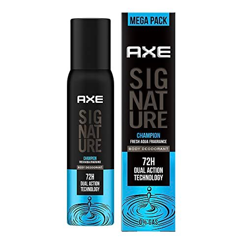 Introducing Signature Champion Deodorant by AXE. AXE offers a wide range of long-lasting fragrances, no-gas perfumes and male grooming products, Axe is your wingman for all your daily grooming needs. These non-gas perfumes are formulated with 72HR Dual Action Technology that keeps you smelling great, feeling fresh and has a lasting odour-protection. So, now you know why Axe is the perfect pick for your daily grooming needs. The road to victory may not always be easy, but true champions never give up! Sail over every obstacle in your path to number one with the Axe Signature Champion no gas Body Deodorant for Men. Infused with notes of Lemon, Mandarin and Aqua cues, this fragrance comes second to none, just like you! Whatās more is, itās got 0% gas, lending to the fresh feel of the product. To use, hold the can straight up about 15cms away from your body. Spray on Chest, Neck and other pulse points so that the scent lingers on. See, itās just that easy and effortless to smell ready. Axeās long-lasting deos boast a Zinc formula that enhances odour protection. Furthermore, theyāre also absolutely safe to spray directly onto the skin as theyāre made with no parabens or dyes. With the new range of Axe deodorants for men, you get the best ever wingman there is. Pick between AXE Intense, Dark Temptation, Mysterious, and many more. Choose yours now!!