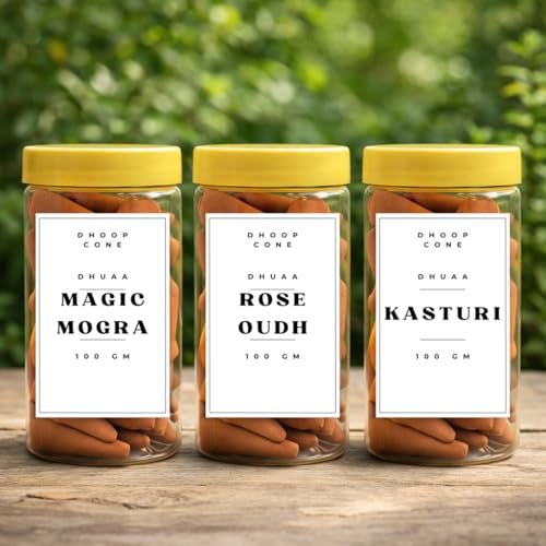 Elevate your daily puja, meditation, and yoga sessions with Dhuaa Sacred Dhoop Cones, a thoughtfully curated combo pack featuring three captivating fragrances ā Magic Mogra, Rose Oudh, and Kasturi. Each jar contains 100 gm of carefully handcrafted incense cones, totalling 300 gm across the set. The Magic Mogra variant offers the timeless, sweet fragrance of jasmine blossoms, while Rose Oudh combines the delicate essence of rose with the deep, woody warmth of oudh for a truly luxurious sensory experience. Kasturi brings a warm, musky richness that soothes the senses and enhances spiritual focus. Designed for long, slow burning, each cone releases a steady, soothing aroma throughout your prayers or relaxation sessions. Packaged in sturdy, resealable glass jars with secure yellow lids, they are easy to store and keep fresh. Ideal for daily worship at your mandir, festive occasions, or simply creating a calm and serene atmosphere at home. This combo also makes a wonderful gift for festivals and spiritual occasions. Bring the sacred fragrance of tradition into your space with Dhuaa Dhoop Cones.
