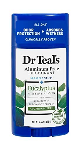 Dr Teal’s Aluminum-Free Deodorant, Eucalyptus, 2.65 oz is clinically proven to absorb wetness plus fight odor all day. Our formula harnesses the strength of Magnesium, an essential mineral for your body and a powerful deodorizer, plus Arrowroot powder and Baking Soda for all-day wetness absorption. Infused with Eucalyptus & Spearmint Essential Oils, Coconut Oil, Jojoba Oil, and Shea Butter to leave your skin smelling and feeling great all day. Dr Teal’s Aluminum Free Deodorants are Cruelty Free, Vegan-Friendly, and Paraben and Phthalate-Free.