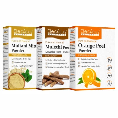 In this combo, you will get 200 grams of Elecious Multani mitti powder ,200 grams of Mulethi powder and 200 Grams of Orange Peel Powder