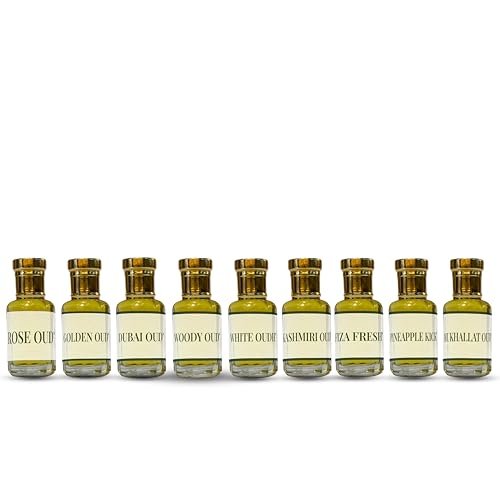 FLAVOURS OF 9 :- This attar set of 9 assorted of our leading products. These are 9 fresh flavours Rose oud attar, Woody oud attar, Dubai oud attar, Golden oud attar, Fiza fresh attar, Kashmiri oud attar, Pineapple kick attar, Mukhallat oud attar, White oud attar.
