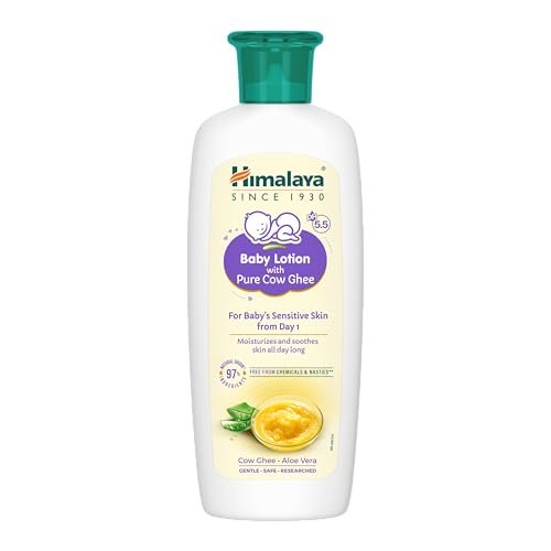 Himalaya Baby Lotion with Pure Cow Ghee and Soothing Aloe Vera Extract is specially formulated to be non greasy and fast aborbent. It maintains moisture all day to nourish, soothe, protect, and improve overall skin condition of your newborn’s sensitive skin. Ideal for baby’s face and body. Whatās Inside: ⢠Baby Lotion with Pure Cow Ghee : Up to 24-hour moisture, All-day protection, Non-greasy (fast-absorbing) for Dry and sensitive skin