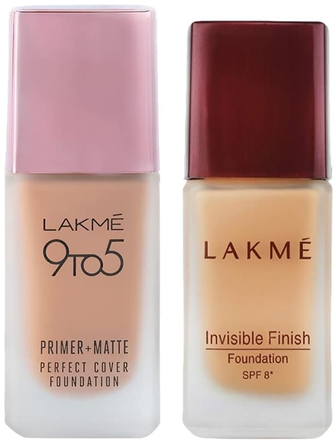 Lakme 9To5 Primer + Matte Perfect Cover Foundation, W240 Warm Beige, 25 mlIt’s time to feel natural and comfortable in your skin with the all-new lakmé 9to5 primer + matte perfect cover foundation. Lakme’s first-ever foundation with a built-in primer, that glides on your skin for a smooth and even skin tone. It blends effortlessly on your skin for a perfect, natural look. A foundation so versatile, your skin is bound to love it as well as look flawless no matter what. Lakme 9to5 primer + matte perfect cover foundation is available in 16 shades that suit 100 percent of Indian skin tones, that looks as natural as your skin, whether it’s day or night. Choose from a range of shades available in warm, cool and neutral undertone. This foundation gives you medium to high coverage as it is buildable in nature for your convenience and as per the occasion. With spf 20 and longwear formula, this foundation will keep your skin looking natural and flawless through the day. Lakmé 9to5 primer + matte perfect cover foundation is all about unleashing your natural self – the very best version of you. After all, your natural, is your perfect. So what are you waiting for. Go get it. Key features: . Built-in primer + matte foundation . Natural, flawless finish . Perfect cover, long-wear formula . Medium to high, buildable coverage . With spf 20 . Available in 16 shades that suit 100 percent Indian skin tones.Lakme Invisible Finish SPF 8 Foundation, Shade 01, 25mlNeed to go to a party after work but no time to visit the salon? Don’t worry and just reach out for the Lakmé Invisible Finish Foundation. This foundation gives you even and glowing skin within minutes. It is endowed with the extra benefit of SPF8 and is extremely light on the skin. It’s ideal when you want to look fresh but not made up, for an everyday, natural look. It comes with a spatula applicator that helps you apply it evenly over your skin. With the Lakmé Invisible Finish Foundation, face makeup is so easy! Buy this bottle and make your way towards perfection! For picture-perfect skin, this ultra-light, water based foundation with invisible finish is ideal for that natural exuberance. SPF 8 shields the skin from harmful rays and prevents skin darkening, keeping you looking young & fresh.Do match the shade to your natural skin tone. Lakmé is one of India’s leading color cosmetic brands offering a wide range of high-end, world-class color cosmetics and skincare products. Lakmé has a vast product range specially crafted by experts for the Indian skin. The brand has also been redefining fashion in India for over 15 years with Lakmé Fashion Week, India’s premier fashion event. Composition : Cyclomethicone, Magnesium Sulphate, Laureth 4