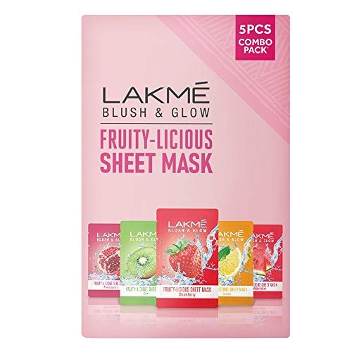 Lakme brings to you its first range of exciting Sheet Masks from blush and glow. If you are facing dull, dry, patchy skin that is yearning for some hydration that is infused with the goodness of your favourite fruits. If your skin wants to get a glow that feels like a fruit facial. Our sheet masks are meant to give you exactly that! Now soak your face in the goodness of 100% pure fruit extracts with the range of Lakme Blush & Glow Fruity-licious Sheet Masks. As you leave on this delightfully refreshing sheet mask, your face gets a burst of freshness and a gorgeous fruit-kissed glow. In just 15 minutes you feel rejuvenated like just out of a fruit facial. What’s more, the light, breathable fabric fits your face perfectly and smells oh! so delicious. It’s the ultimate way to pamper and nourish your skin and make it look fresh and feel soft and supple. Just tear, wear and get the glow! Try our collection of your favourite fruits – strawberry, watermelon, lemon, kiwi and pomegranate, now and get addicted to the fruity-licious experience! For best results, cleanse face first with Lakme Blush & Glow face wash. For all skin types. Dermatologically tested.