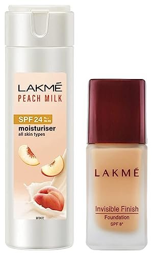 Lakme Invisible Finish SPF 8 Foundation, Shade 01, 25mlNeed to go to a party after work but no time to visit the salon? Don?t worry and just reach out for the Lakmé Invisible Finish Foundation. This foundation gives you even and glowing skin within minutes. It is endowed with the extra benefit of SPF8 and is extremely light on the skin. It?s ideal when you want to look fresh but not made up, for an everyday, natural look. It comes with a spatula applicator that helps you apply it evenly over your skin. With the Lakmé Invisible Finish Foundation, face makeup is so easy! Buy this bottle and make your way towards perfection! For picture-perfect skin, this ultra-light, water based foundation with invisible finish is ideal for that natural exuberance. SPF 8 shields the skin from harmful rays and prevents skin darkening, keeping you looking young & fresh.Do match the shade to your natural skin tone. Lakmé is one of India?s leading color cosmetic brands offering a wide range of high-end, world-class color cosmetics and skincare products. Lakmé has a vast product range specially crafted by experts for the Indian skin. The brand has also been redefining fashion in India for over 15 years with Lakmé Fashion Week, India?s premier fashion event. Composition : Cyclomethicone, Magnesium Sulphate, Laureth 4Lakme Peach Milk SPF 24 PA Sunscreen Moisturiser, 120 mlIs your skin losing moisture as the day goes by ? Lakme brings to you a moisturizer which is a blend of wholesome peaches and milk, which nourishes the skin deeply without making it appear oily. This light moisturizer dozed with SPF 24 has a soothing fragrance, which will make you fall in love with it instantly. This lotion easily absorbs into the skin to lock moisture for 12 hours to give you soft, smooth and glowing skin. Choose the right Peach Milk Moisturizer: for light nourishment pick this classic lotion. For intense nourishment – try the Peach Milk Winter lotion. For nourishment with sun protection, try the Peach Milk SPF lotion. For best results – use everyday for nourished skin that glows. About Lakme: Lakme is India?s No.1 Color Cosmetics brand offering a wide range of high-end, world-class color cosmetic and skincare products. Lakme has a vast product range specially crafted by experts for the Indian skin. The brand has also been redefining fashion in India for over 15 years with Lakme Fashion Week, India?s premier fashion event. Allergies: In the unlikely event of skin irritation, stop using and consult a doctor immediately. Warning: Avoid contact with eyes. Wash your eyes thoroughly with clean water in case of contact.