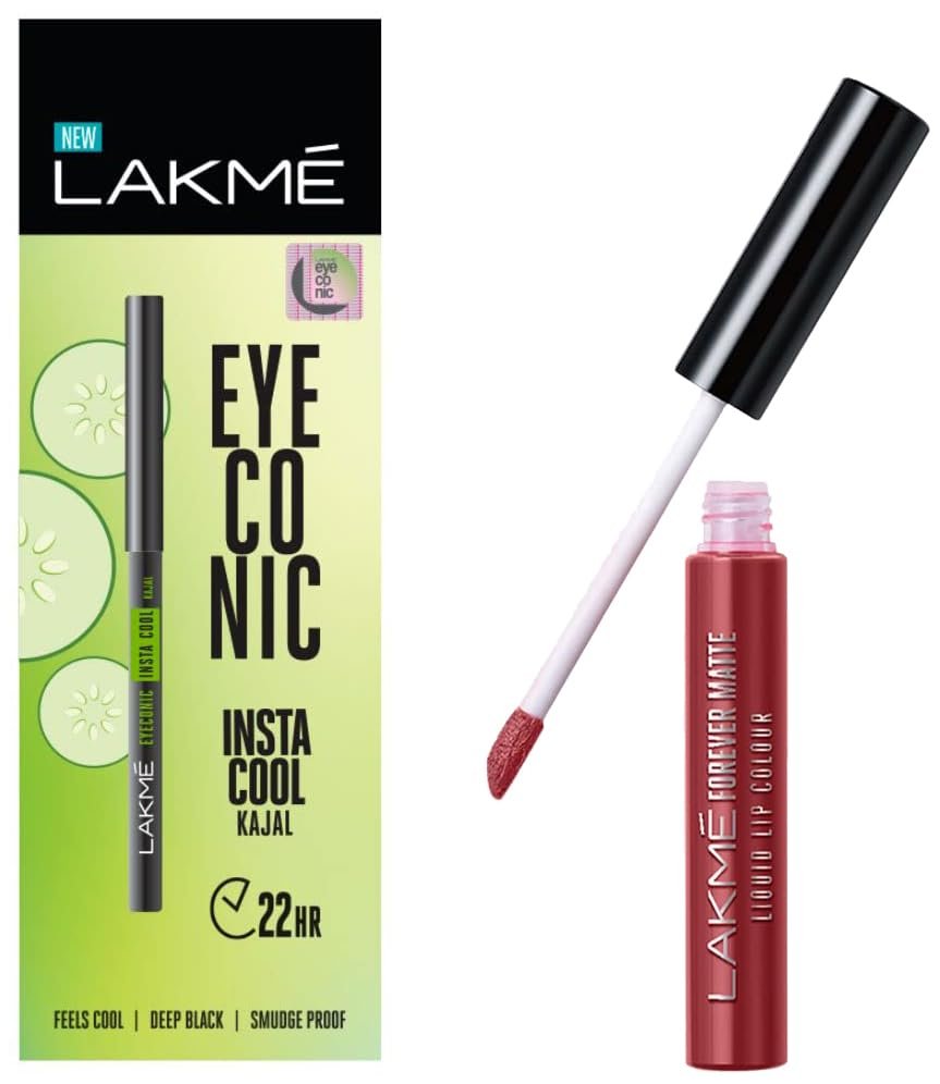 LAKMÉ Forever Matte Liquid Lip Color – 34 Brown Sheer & LAKMÉ Eyeconic Insta Cool Kajal Combo
