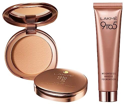 Lakmé 9 to 5 Weightless Mousse Foundation, Rose Ivory, 25gLakmé 9 To 5WEIGHTLESS Mousse Foundation is your answer to a workings women?s barrier to using foundation. It is a lightweight foundation meant for everyday use. It is so lightweight that you won?t even feel you are wearing foundation. It not only blends in effortlessly, but gives a matte finish that lasts through the say. It is available in 4 shades and it extremely convenient to carry. Foundation with new formula that feels soft and incredibly weightless and is perfect for everyday office use. It blends effortlessly onto skin to conceal imperfections with a matte finish that stays through the day. With complete coverage it?s a foundation so weightless you may forget you are wearing any foundation, Matte finish in a weightless mousse texture, Pocket sized tube that is easy to carry around, Complete coverage, Lightweight and long wear, Available in 4 office-wear shades ? Rose Ivory, Beige Vanilla, Beige Caramel and Rose Honey, Suitable for all skin types, Dermatologically tested. How to apply: Just take a small amount of product with the index finger and start applying it to the skin with your fingertips. Usually, you can just apply the mousse in four places: the forehead, nose, chin and cheekbones. Blend into your skin starting from the center of the skin outwards, taking care to cover your face including your neck.Lakmé 9 to 5 Flawless Matte Complexion Compact, Melon, 8gFor an oil-free, even and natural complexion, this is a perfect pick! The Lakmé 9 To 5 Flawless Matte Complexion is a compact that brings out your amazing skin tone and enhances your beauty. It is fortified with a unique Vitamin E formula to nourish your skin and give it a radiant look that lasts you all day. The compact is in a dazzling almond shade that blends into your complexion so well it can even be used as a concealer to hide your spots and freckles. This pack will fit into your make-up kit easily and it comes with a mirror and soft sponge to give you that ideal even-toned appearance. It has great features: like matte look throughout the day, Infused with Vitamin E and unique oil absorbing formula that nourishes and conditions the skin, Matte texture that gives you an even toned skin, The in-built mirror and puff makes it ideal for working women. How to apply: Wipe the powder puff over the compact powder. Shake the puff to remove the excess powder and wipe it gently across your face and neck for a flawless look. Pro Tip: For a complete flawless look, use along with Lakmé 9 to 5 Flawless Makeup. It’s the total touch-up you always wanted.