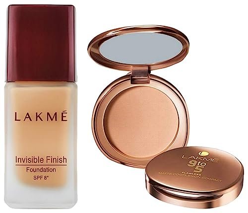 Lakmé Invisible Finish SPF 8 Foundation, Shade 01, 25mlNeed to go to a party after work but no time to visit the salon? Don’t worry and just reach out for the Lakmé Invisible Finish Foundation. This foundation gives you even and glowing skin within minutes. It is endowed with the extra benefit of SPF8 and is extremely light on the skin. It’s ideal when you want to look fresh but not made up, for an everyday, natural look. It comes with a spatula applicator that helps you apply it evenly over your skin. With the Lakmé Invisible Finish Foundation, face makeup is so easy! Buy this bottle and make your way towards perfection! For picture-perfect skin, this ultra-light, water based foundation with invisible finish is ideal for that natural exuberance. SPF 8 shields the skin from harmful rays and prevents skin darkening, keeping you looking young & fresh.Do match the shade to your natural skin tone. Lakmé is one of India’s leading color cosmetic brands offering a wide range of high-end, world-class color cosmetics and skincare products. Lakmé has a vast product range specially crafted by experts for the Indian skin. The brand has also been redefining fashion in India for over 15 years with Lakmé Fashion Week, India’s premier fashion event.Lakmé 9 to 5 Flawless Matte Complexion Compact, Almond, 8gFor an oil-free, even and natural complexion, this is a perfect pick! The Lakmé 9 To 5 Flawless Matte Complexion is a compact that brings out your amazing skin tone and enhances your beauty. It is fortified with a unique Vitamin E formula to nourish your skin and give it a radiant look that lasts you all day. The compact is in a dazzling almond shade that blends into your complexion so well it can even be used as a concealer to hide your spots and freckles. This pack will fit into your make-up kit easily and it comes with a mirror and soft sponge to give you that ideal even-toned appearance. It has great features: like matte look throughout the day, Infused with Vitamin E and unique oil absorbing formula that nourishes and conditions the skin, Matte texture that gives you an even toned skin, The in-built mirror and puff makes it ideal for working women. How to apply: Wipe the powder puff over the compact powder. Shake the puff to remove the excess powder and wipe it gently across your face and neck for a flawless look. Pro Tip: For a complete flawless look, use along with Lakmé 9 to 5 Flawless Makeup. It’s the total touch-up you always wanted.