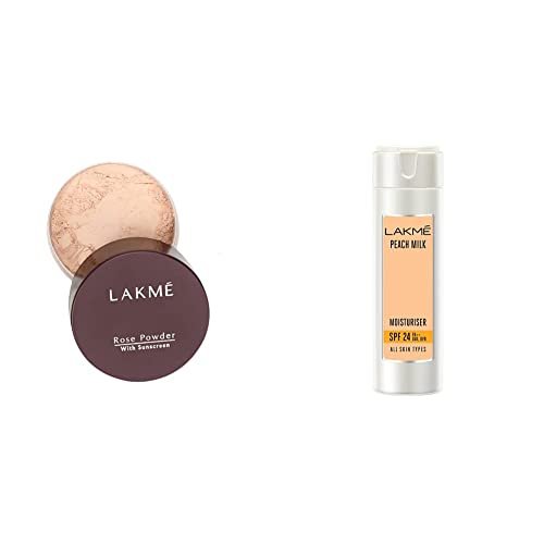 Lakmé Rose Face Powder With Sunscreen, Soft Pink, 40 gBought to you from the house of Lakmé Classics, The Lakmé Rose Powder is a classic must-have. Blush your cheeks with this Lakmé Rose Powder which has a light rosy fragrance & sunscreen to protect your soft, peachy skin. The Lakmé Rose Powder comes in two warm pink shades which you can pick according to your skin type and occasion. Add the Lakmé Rose Powder to your make up kit right away because you need that rosy glow! But the Lakmé Rose Powder now! Flawless Skin Every Day If flawless and even skin is what you wish to have, the Lakmé Rose Powder is just right for you. This Lakmé Rose Powder is infused with extracts of real roses that is sure to nourish your skin. It blends easily and protects your skin from the harmful rays of the sun. Whether you are heading to work or a special occasion, this Lakmé Rose Powder 40 g will give your face a gorgeous look every single day. Apply it on your face or over your foundation and say goodbye to oily skin. Must-Have for Every Beauty-Conscious Woman. The Lakmé Rose Powder makes a great addition to your makeup kit. You can either use a foundation brush or the available puff to apply this Lakmé soft pink rose powder on your face. Blend it easily using gentle strokes to achieve a smooth and even finish. Suitable for daily use, the Lakmé rose powder with sunscreen compact powder will let you breeze through the day looking fabulous. This classic rose powder has a sweet and subtle fragrance of roses that feels good on your face, while its matte finish controls oily skin for long hours. Features and Benefits: Loose face powder with rose fragrance, Contains extracts of real roses, Protects skin from the harmful rays of the sun, Controls oil for long hours.Lakmé Peach Milk SPF 24 PA Sunscreen Moisturiser, 120 mlIs your skin loosing moisture as the day goes by ? Lakmé brings to you a moisturizer which is a blend of wholesome peaches and milk, which nourishes the skin deeply without making it appear oily. This light moisturizer dozed with SPF 24 has a soothing fragrance, which will make you fall in love with it instantly. This lotion easily absorbs into the skin to lock moisture for 12 hours to give you soft, smooth and glowing skin. Choose the right Peach Milk Moisturizer: for light nourishment pick this classic lotion. For intense nourishment – try the Peach Milk Winter lotion. For nourishment with sun protection, try the Peach Milk SPF lotion. For best results – use everyday for nourished skin that glows. About Lakmé: Lakmé is India’s No.1 Color Cosmetics brand offering a wide range of high-end, world-class color cosmetic and skincare products. Lakmé has a vast product range specially crafted by experts for the Indian skin. The brand has also been redefining fashion in India for over 15 years with Lakmé Fashion Week, India’s premier fashion event. Allergies: In the unlikely event of skin irritation, stop using and consult a doctor immediately. Warning: Avoid contact with eyes. Wash your eyes thoroughly with clean water in case of contact.