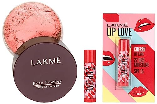 Lakmé Rose Face Powder, Warm Pink, 40gBought to you from the house of Lakmé Classics, The Lakmé Rose Powder is a classic must-have. Blush your cheeks with this Lakmé Rose Powder which has a light rosy fragrance & sunscreen to protect your soft, peachy skin. The Lakmé Rose Powder comes in two warm pink shades which you can pick according to your skin type and occasion. Add the Lakmé Rose Powder to your make up kit right away because you need that rosy glow! But the Lakmé Rose Powder now!Flawless Skin Every DayIf flawless and even skin is what you wish to have, the Lakmé Rose Powder is just right for you. This Lakmé Rose Powder is infused with extracts of real roses that is sure to nourish your skin. It blends easily and protects your skin from the harmful rays of the sun. Whether you are heading to work or a special occasion, this Lakmé Rose Powder 40 g will give your face a gorgeous look every single day. Apply it on your face or over your foundation and say goodbye to oily skin.Must-Have for Every Beauty-Conscious WomanThe Lakmé Rose Powder makes a great addition to your makeup kit. You can either use a foundation brush or the available puff to apply this Lakmé soft pink rose powder on your face. Blend it easily using gentle strokes to achieve a smooth and even finish. Suitable for daily use, the Lakmé rose powder with sunscreen compact powder will let you breeze through the day looking fabulous. This classic rose powder has a sweet and subtle fragrance of roses that feels good on your face, while its matte finish controls oily skin for long hours.Features and Benefits:• Loose face powder with rose fragrance• Contains extracts of real roses• Protects skin from the harmful rays of the sun• Controls oil for long hours• Easy application• Available in different shadesLakmé Lip Love Chapstick Cherry, 4.5 gGet soft lips all day with all new Lakmé lip love. Lakmé lip love is a new super moisturizing formula in a convenient and vibrant pack. It gives you 22 hours of intense moisture so you can say bye to dry, with soft lips that last all day. It has spf 15 that helps protect your lips from the harmful rays of the sun. For your lips, with love get intense lip care with just the right touch of color, choose from 5 vibrant shades and 1 colorless variant. Introducing an innovative color-changing ‘insta pink’ variant which starts off as sheer and on application transforms into a shade of pink that is unique only to you. One quick swipe and you can seal in the moisture to get soft lips all day. Choose from vibrant shades: cherry, strawberry, caramel, mango, apricot, pure lip care – colorless insta pink – color changing. How to apply your everyday easy guide to soft lips: step 1: Uncap the stick step 2: Twist open the pack such that the bullet comes outstep 3: Roll the bullet across your lips starting from the edges to the centre step 4: Flaunt soft moisturized lips for 22 hrs.