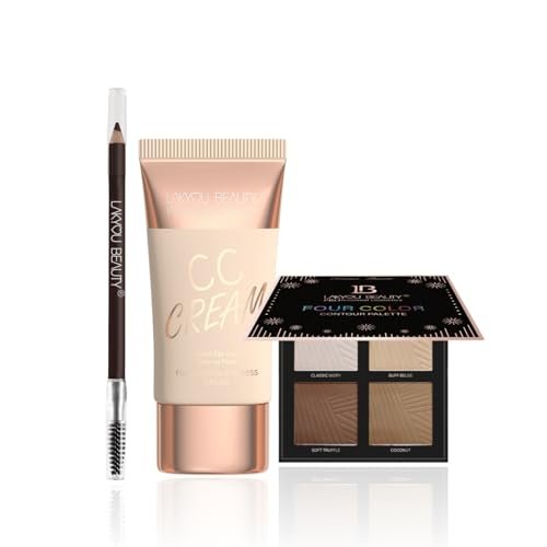 Lakyou Beauty Face Makeup Combo Kit includes CC Cream Instant Fair Look, Four Color Contour Palette and Eyebrow Pencil with spoolie for a complete everyday makeup routine. The CC cream provides a smooth base with instant bright look, the 4 shade contour palette helps sculpt and highlight your face, and the eyebrow pencil fills and defines brows for a clean finished appearance. Perfect for daily use, office, party and beginner makeup.