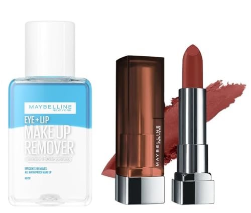 Elevate your makeup routine with this perfect pairing from Maybelline New York. This set includes the Color Sensational Creamy Matte Lipstick in shades, a rich, warm brown that offers a sophisticated matte finish and complements any skin tone. Its creamy formula ensures long-lasting color that glides on smoothly for a flawless look. To make your beauty regimen even easier, this set comes with a 40ml bottle of Maybelline New York Makeup Remover. This gentle yet effective remover effortlessly wipes away lipstick and other makeup, leaving your skin clean and refreshed without irritation.