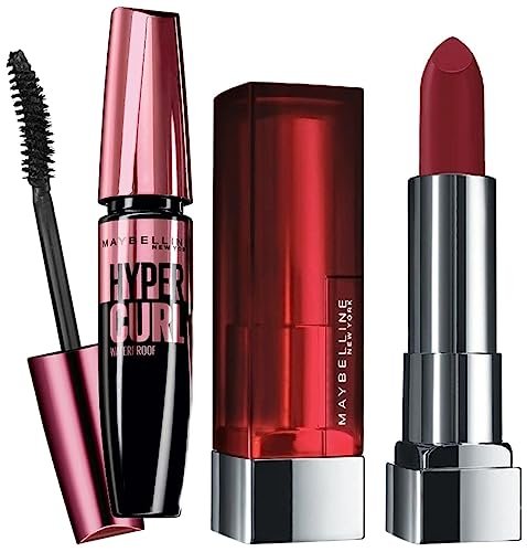 Maybelline New York Hypercurl Mascara Waterproof, Black, 9.2mlMaybelline New Yorkās Volum ‘Express Hypercurl Mascara gives curls eyelashes with a curl lock formula that lasts for up to 18 hours. The black mascara is available in washable and waterproof variants. Just one sweep of the Maybelline Mascara helps you get lashes that have spectacular volume and thickness. The Hypercurl formula in the Maybelline Volum’ Express Mascara works to achieve a dual effect – it instantly builds 3 times the volume in your lashes and helps curl them, giving you thick, curly lashes that look ultra-glam. HOW TO USE: Step 1. Start at the base of your lashes with the mascara brush and slowly drag it upwards in a zig-zag motion. Step 2. Do not let mascara dry in between coats. Use the wand to comb out any clumps on your lash tips. Step 3. At the end of the day, easily remove the Maybelline Hypercurl Mascara with Maybelline New Yorkās makeup remover Get dramatically long, curly lashes that make you feel wide-eyed and confident with the new Maybelline Hypercurl Mascara. Just one sweep with the mascara wand helps you get lashes that have spectacular volume and thickness. The Hypercurl formula in the mascara works to achieve a dual effect: it instantly builds 3 times the volume in your lashes and helps curl them, giving you thick, curly lashes that look ultra glam. The product also has a special curl-lock formula that defines and locks in the curliness of your lashes for up to 18 hours. Maybelline Hypercurl Waterproof Mascara comes with a unique anti-clump applicator brush that separates each lash while curling them, avoiding the clumpy, messy effect that can ruin your entire look. It is waterproof, which increases the staying power, so you get beautiful lashes which stay that way for the better part of the day. Apply an initial coat on your upper lashes and wait for a few minutes for it to dry before applying the second coat. You may choose to curl your lashes with an eyelash curler for easier application and a better definition. Since your lower lashes are shorter, apply the mascara in soft, brisk strokes to ensure even distribution and avoid clumping. Product Features The mascara is designed exclusively for women. It comes with an anti-clump brush to give your lashes a better definition. Special curl-lock formula gives you ultra glam lashes with increased staying power. It is waterproof and lasts for up to 18 hours. The product is available in a 9.2 mlbottle.Maybelline New York Color Sensational Creamy Matte Lipstick, 695 Divine Wine, 3.9gDiscover Maybelline New Yorkās Color Sensational Creamy Matte Lipsticks that are hydrating and comfortably matte! Infused with pure precious oils that are filled with moisture, the smooth, creamy, non-drying matte lipsticks leave the lips with a sensuous finish with a comfortable feel. The Creamy Mattes are available in 30+ stunning and highly pigmented lipstick shades, ranging from classic red lipsticks such as Rich Ruby and Siren in Scarlet to flawless nude lipsticks like Nude Nuance and Touch of Spice.