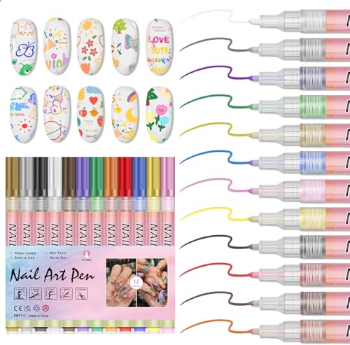 Nail Art Pens Set –12 Colors Nail Polish Graffiti Pens – Nail Varnish Pens – Waterproof Quick Dry Nail Drawing Pen, Acrylic Marker Pens 0.7mm Fine Tip Nail Point Graffiti Pens Nail Art Kit