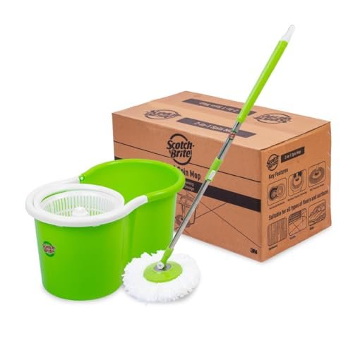 The Scotch-Brite Supreme Spin Mop is designed for powerful and convenient floor cleaning. It features a steel spinner bucket, big wheels for easy mobility, a puller handle, and an in-built liquid soap dispenser. The adjustable telescopic handle ensures comfort during use.