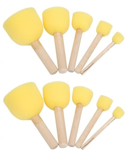 Foam Head – The sponges feature a smooth, durable foam surface that provides even and precise application of paint, ideal for stenciling, crafting, and detailed work on various surfaces.Ergonomic Wooden Handle – Each dabber is equipped with a sturdy, comfortable wooden handle that ensures a secure grip for controlled use during projects, reducing hand fatigue during long sessions.Versatile for Multiple Mediums – Good for a range of DIY activities, including furniture restoration, arts and crafts, stenciling, and home decor projects, the sponges are compatible with paints, stains, and other craft mediums.Set of 10 Sizes – The set includes 10 round sponges of 5 sizes 2pc each size , allowing for both small, detailed work and larger surface coverage, making it a versatile toolset for different projects.