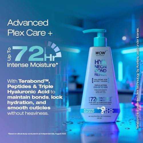 This conditioner is a lightweight yet deeply nourishing treatment for hair prone to dryness, damage, or frizz. Powered by the Activated Naturals Formula, it combines triple hyaluronic acid, peptides, Terabond, and plant keratin to help lock in hydration, reinforce strength, and smooth the cuticle layer for lasting softness and shine. The multi-action blend works in layers: hyaluronic acid helps draw and hold moisture at different levels of the hair fiber, peptides support inner bonds to improve resilience, and Terabond works to strengthen the look of damaged areas and support sleeker, more polished lengths over time. A plant-keratin infusion further helps tame rough texture and boost shine, leaving hair looking healthy and glossy. The formula conditions strands without heaviness, detangling lengths with ease and improving slip to reduce tug and breakage during styling. It helps control frizz while maintaining natural bounce, making it suitable for daily use across straight, wavy, curly, and coily hair types. Free from sulphates and parabens, it supports a cleaner hair-care routine and is safe for color-treated or chemically processed hair. Best used after the WOW Hyaneon Bond Repair Moisturising Shampoo, this conditioner provides the essential moisture-seal step in a complete bond-care regimen. With regular use, hair feels softer, looks shinier, and more resilient against dryness and external stressors.